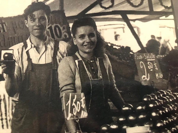 Los abuelos de Cédric en su puesto de frutas y hortalizas.
