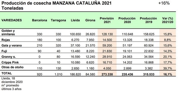 Así pues, a pesar de las heladas de la última primavera, este año en Cataluña se prevén cosechar 273 millones de kg de manzana; "lo que supone recuperar en parte el potencial perdido en 2020; una campaña que recogió 235 millones de kg; lejos de los 315 del 2019, que fue año potencial con respecto a la cosecha de manzana y que implica que, con la previsión de este año, la producción será un 13% inferior a la que sería habitual", ha dicho Joan Serentill. Respecto a la producción de manzana en España, Afrucat supondrá el 65% de los 500 millones de kg de esta campaña.