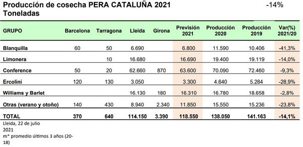 En cuanto a la pera, la previsión de cosecha en Cataluña para este año es de 118 millones de kg, lo que supone un descenso del 14% respecto al año pasado, una campaña que recogió 138 millones de kg. Respecto al potencial de producción, que está fijado en 142 millones de kg para la pera, la predicción para la cosecha de este 2021 supone un descenso del 17%. En relación con el estado español, donde el potencial de producción es de casi 300 millones de kg, cabe destacar que Afrucat copa la mitad de la producción total.