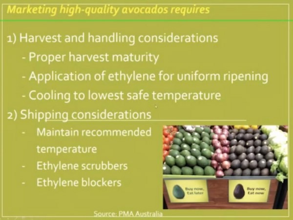 Sargent señala que la comercialización de aguacates de alta calidad requiere que la cosecha y el manejo se realicen en la madurez adecuada. "Así que hay que aplicar etileno para una maduración uniforme y después enfriarlo rápidamente hasta la temperatura más baja que sea segura. Durante el transporte, debe mantenerse la temperatura recomendada y pueden utilizarse depuradores o bloqueadores de etileno durante el tránsito", añade.