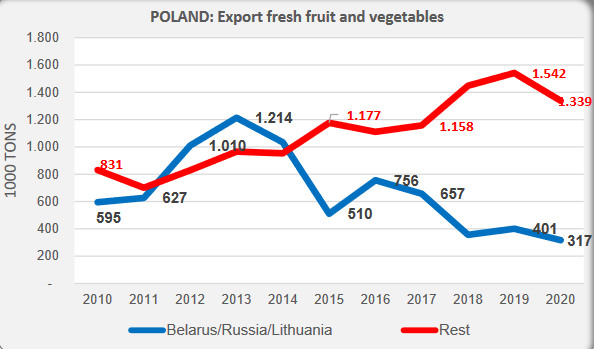 El año pasado, Polonia exportó muchas menos frutas y hortalizas con respecto a los años anteriores, principalmente debido a la reducción de las ventas en el exterior de manzanas, el producto de exportación más importante para Polonia. El país también exportó menos champiñones, el segundo producto de exportación. Desde hace años, Bielorrusia es el mercado de destino más importante para los productos hortofrutícolas polacos, aunque ahora ha visto debilitarse su posición dominante (quizás debido al cumplimiento más estricto de las normativas). En 2016, Polonia exportó 690.000 toneladas de frutas y hortalizas a Bielorrusia, mientras que en 2019 los envíos bajaron a 350.000 toneladas y el año pasado a 260.000 toneladas.