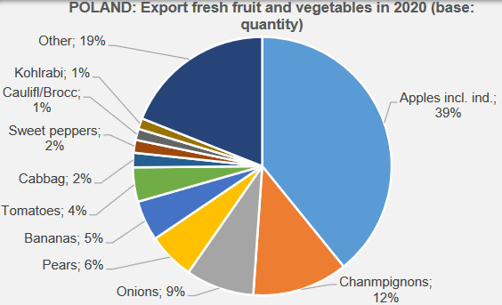 El producto estrella de las exportaciones polacas es la manzana. Con 645.000 toneladas, este producto representa casi el 40% de las exportaciones totales de frutas y hortalizas frescas de Polonia. Después de Bielorrusia, Egipto es el segundo comprador más grande de manzanas polacas. En 2020, Egipto compró 75.000 toneladas y en 2019 casi 130.000 toneladas de manzanas polacas.