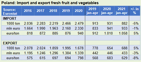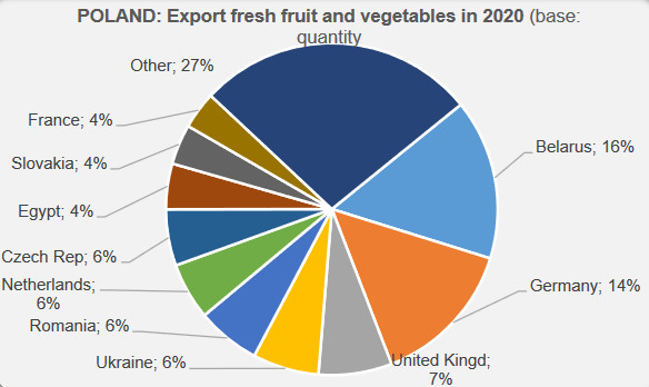 A pesar de ser un gran productor, Polonia es un importador neto de frutas y hortalizas. El año pasado, Polonia importó 2,5 millones de toneladas de frutas y hortalizas frescas y exportó 1,7 millones de toneladas. Polonia ocupa el décimo puesto entre los países importadores de frutas y hortalizas y el decimonoveno entre los exportadores, según los análisis de la consultora holandesa Fruit & Vegetable Facts.