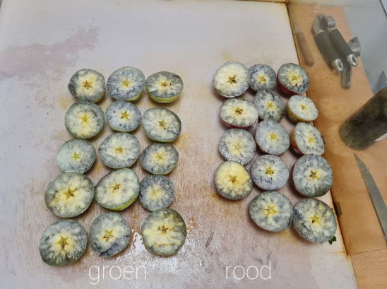 Prueba de almidón en manzanas Jonagold (14-9-2021). A la izquierda se ven las manzanas verdes, a la derecha las manzanas rojas.