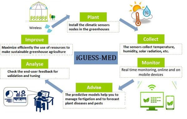 Antonio Affinito, ingeniero de la EVJA y director técnico de iGUESS-MED, explica que "el DSS proporcionará información sobre la evolución de muchos procesos biológicos y físicos que tienen lugar dentro de los invernaderos, como el desarrollo de plagas y enfermedades, el crecimiento de las plantas, la evapotranspiración, el contenido de agua del suelo, el estado nutricional y el clima. Los cultivadores pueden controlar fácilmente todos los procesos gracias a una WebApp específica optimizada para tablets y smartphones". Los procesos se compararán con unos valores de referencia, con el fin de alertar a los cultivadores en tiempo real sobre la necesidad de acciones correctivas (riego, aplicación de nutrientes, deshumidificación, aplicación de control biológico, etc.).