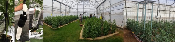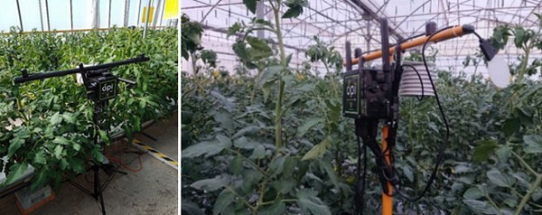 Instalación de sensores climáticos en tomates cultivados sin suelo en Pontecagnano (Italia) (foto izquierda) y en suelo en Almería (España) (foto derecha)