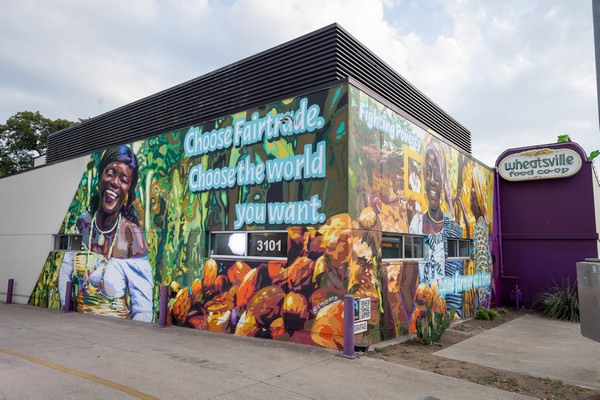 La campaña "Elige el comercio justo. Elige el mundo que quieres" presenta murales en Austin, Minneapolis y Tacoma (WA) que conectan las historias de las personas que cultivan productos como el cacao, las bananas, el café y otros, con los impactos positivos del comercio justo. Esta campaña llevó los murales a Denver, Los Ángeles y Nashville en 2020.