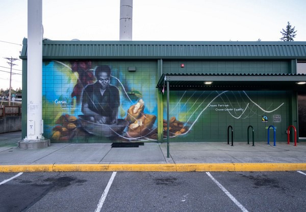 Mural de Carmen Mueses en Tacoma, Washington. Fairtrade América y Central Co-op se asociaron para crear un mural con una productora de cacao de comercio justo. La artista local Mari Shibuya retrató a Carmen Mueses, miembro de CONACADO, en la República Dominicana.