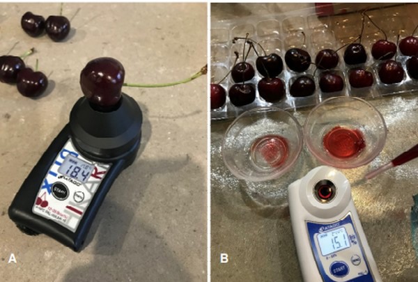 Instrumentos portátiles de Atago utilizados para medir la concentración de sólidos solubles en cerezas frescas; de forma no destructiva por infrarrojos (A) y de forma destructiva en zumo por refractometría (B).