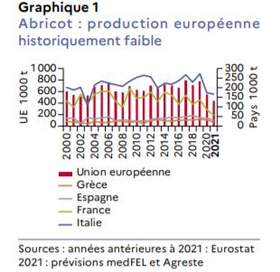 ha descendido un 20% respecto a la ya baja producción de 2020 y un 37% en comparación con el nivel medio de las campañas de 2016 a 2020. Es la producción más baja desde hace al menos 20 años, como consecuencia de las heladas, que han afectado gravemente a todos los países europeos productores de albaricoques. En Italia, Grecia y España, la cosecha ha bajado un tercio en comparación con el nivel medio de 2016-2020.