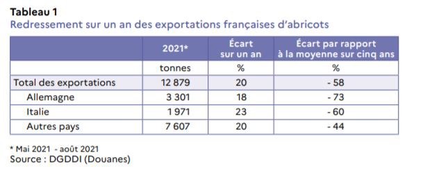 En la campaña 2021 (de mayo a agosto), las exportaciones de albaricoques franceses vuelven a aumentar (+20%) con respecto a 2020, después de haber disminuido a la mitad en 2020 (tabla 1). Esta recuperación de las exportaciones se produce en un contexto en el que el mercado europeo ha sido históricamente deficitario en cuanto a albaricoques. Los volúmenes siguen siendo, sin embargo, un 58% inferiores a la media de 2016-2020.