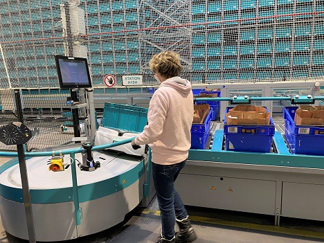 Estación de preparación. La zona seca cuenta con 8 estaciones y los operarios recogen los productos transportados por los robots y los depositan en los contenedores azules.