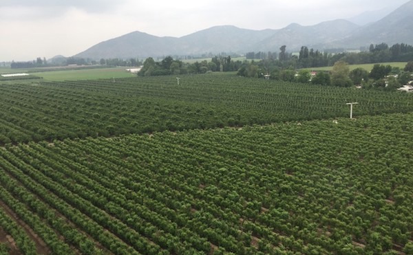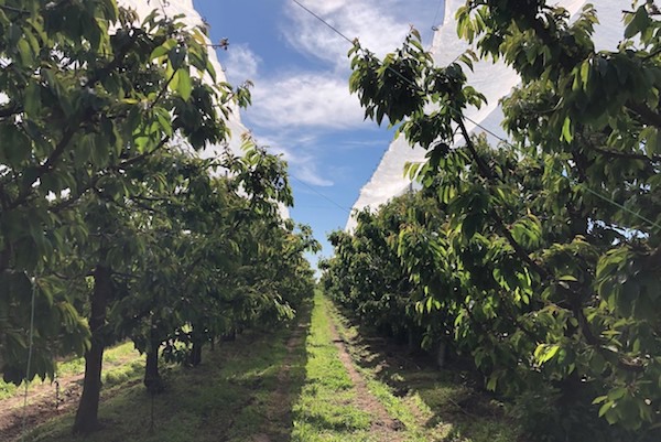 Daniel Ho (primero por la izquierda) y su equipo en un campo de cerezos en Chile