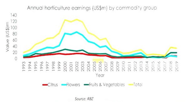 Los ingresos anuales de la horticultura en las últimas décadas muestran una lenta recuperación (fuente: Banco de la Reserva de Zimbabue; foro de inversión del HDC)