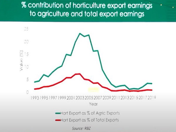 En la actualidad, la horticultura contribuye en un 6,5% a la producción agrícola total y en un 0,7% al producto interior bruto total de Zimbabue; la agricultura zimbabuense obtiene actualmente 77 millones de dólares en ingresos por exportación.