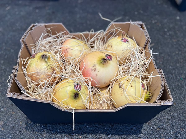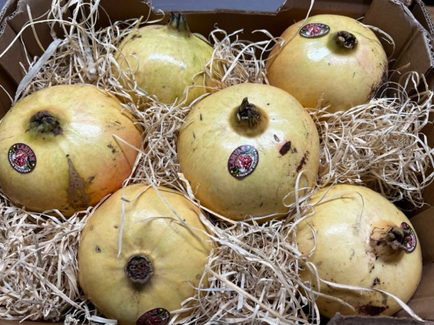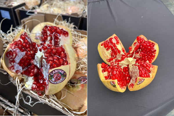 "Estas granadas nos permiten destacar en el mercado. Son de la conocida variedad Mollar, pero más dulces que las españolas, y también tenemos disponibles muchos calibres grandes (tamaño 12). Algunas granadas pesan más de un kilo cada una", dice Ibrahim con entusiasmo. "Los precios de los tamaños grandes rondan los 14/15 euros por caja y los de los tamaños pequeños entre 10 y 12,50 euros".