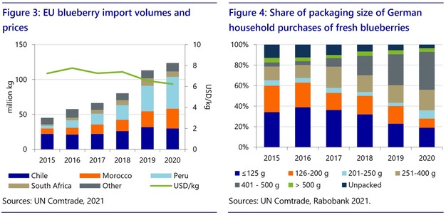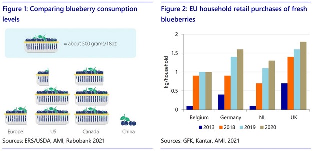 Un tema satisfactorio y recurrente en los discursos de las distintas ediciones del GBC es el continuo y firme crecimiento del mercado (potencial) de las berries, en particular de los arándanos. Los niveles de consumo per cápita varían significativamente en todo el mundo, incluso dentro de mercados como el de la UE, que a menudo se considera maduro (figuras 1 y 2). Por no hablar de Asia, donde el consumo apenas ha despegado. Hay varios factores que impulsarán un mayor consumo de berries: la creciente disponibilidad, la mejora de la calidad y la consistencia, la creciente concienciación por la salud y la continua preferencia por la conveniencia y la asequibilidad.