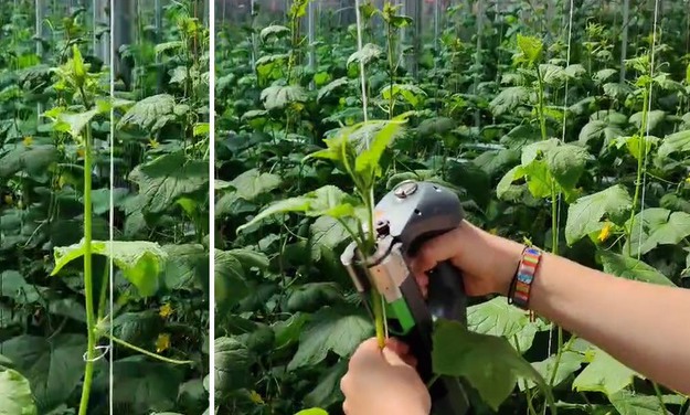El Tom System es una innovación de la empresa española Agrifast y representa una alternativa a las grapas de plástico y al atado manual. Podría recordar a una grapadora: con una anilla metálica, se ata la planta al alambre de cultivo. El sistema se desarrolló hace casi una década y, desde entonces, los productores de todo el mundo han empezado a atar sus cultivos a los alambres de manera automática con una pequeña anilla de metal. El sistema se utiliza para pepinos, tomates, pimientos y berenjenas, y combinado con Biotwine, permite que los residuos sean 100% compostables.