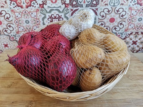 Cebollas, ajos y patatas envasadas en mallas. El uso es muy amplio. También es posible envasar manzanas, peras y todas aquellas referencias que tengan cierta consistencia.