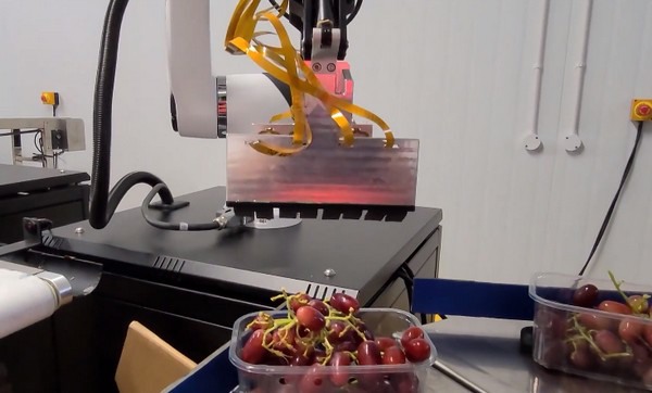 "El robot estima el peso y puede cortar el racimo de uvas para introducir el peso correcto. Los distintos robots de la línea pueden hablar entre sí para asegurarse de que el peso y también la presentación sean correctos. Además, puede haber una persona en la línea para comprobar la presentación final.
