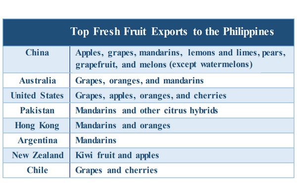 Desde el inicio de la COVID-19, los consumidores de Filipinas han incorporado más fruta fresca a su dieta. Las exportaciones mundiales de frutas frescas a Filipinas se incrementaron un 36% hasta un valor de 695 millones de dólares en 2020 y se prevé que crezcan otro 5% en 2021. No obstante, las exportaciones estadounidenses cayeron un 35% en 2020 hasta situarse en 32,5 millones de dólares, debido a las complicaciones persistentes con el transporte marítimo. Los comerciantes confían en que, una vez se alivie la presión sobre la cadena de suministro global, las exportaciones de frutas frescas de los Estados Unidos a Filipinas regresen a los 50 millones de dólares en ventas anuales. Filipinas cultiva numerosas frutas tropicales y se alienta a los exportadores estadounidenses a buscar oportunidades de contraestación y frutas cuyo cultivo no está extendido en la región de Asia-Pacífico.