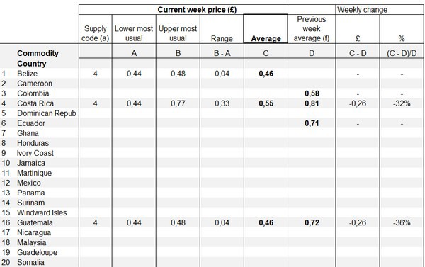La siguiente tabla muestra los precios medios al por mayor de las bananas por país de origen. Los precios son las medias nacionales de los precios habituales de las bananas en los mercados mayoristas de Birmingham y Londres. Esta publicación se actualiza semanalmente.
