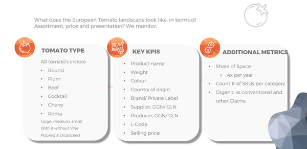 "Cada parte usa la información que le resulte más valiosa. Por ejemplo, los exportadores y los supermercados muestran especial interés en el precio y el origen, los productores en la calidad del producto, los obtentores en los tipos y variedades ofrecidos y los envasadores en el tipo de envase. Toda esta información se recopila y muestra en un único dashboard. Además del país de origen y el tipo de tomate, también registramos la información del proveedor con el código GLN/GGN si es posible".