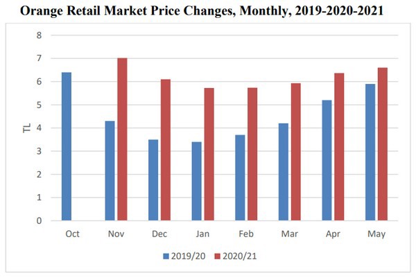 Por otra parte, los precios de venta al público disminuyeron en enero y febrero de 2021, desde que el GdT aplicó restricciones a la exportación para hacer frente a las regulaciones de la UE en materia de residuos de pesticidas. Muchas exportaciones de cítricos turcos son rechazadas desde la UE y Rusia debido a unos niveles de residuos por encima de los permitidos para la importación. La reducción de las exportaciones ha contribuido a la disminución de los precios del mercado nacional de naranjas.