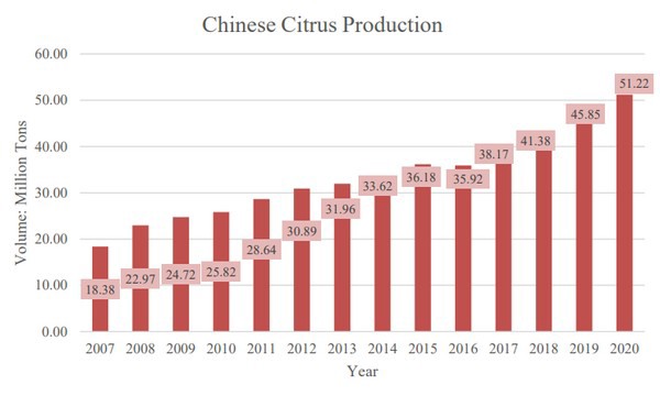 Está previsto que la producción de naranja en la campaña 2021/2022 crezca ligeramente hasta 7,6 millones de toneladas. La previsión se basa en la plantación de nuevas superficies de Navel en Jiangxi y en el aumento de los rendimientos en las provincias de Hubei y Hunan, lo cual compensa los descensos en la provincia de Jiangxi, donde la enfermedad del greening de los cítricos afecta a los cultivos desde hace varios años.