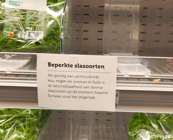 En esta foto de un supermercado holandés se puede leer que "faltan bolsas de lechugas precortadas debido al mal tiempo, la lluvia y la nieve en Italia". En realidad, la situación es ligeramente más compleja. "En algunas zonas de producción, como en Campania, primero hubo un adelanto de la cosecha debido a un tiempo muy caluroso, lo cual provocó el solapamiento de las producciones. Luego, las siguientes siembras se ralentizaron por descensos bruscos de la temperatura y parte de las cosechas no están listas para la época navideña", explica el técnico Marco Bastoni.