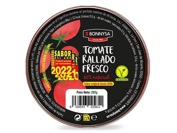 Nuevamente el tomate rallado fresco y natural de Bonnysa se somete al juicio de los consumidores y logra obtener el galardón del Sabor del Año 2022. La obtención de esta distinción es realizada mediante una concienzuda cata ciega llevada a cabo por consumidores reales de la categoría de producto que puntúan diferentes aspectos del producto como el aroma, color, textura y sabor, entre otras características. La puntuación obtenida en todos los aspectos ha sido muy satisfactoria permitiendo a Bonnysa nuevamente obtener el título frente a otras opciones de la competencia.