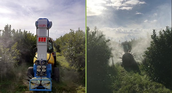 Las pruebas realizadas recientemente utilizan dos pares de difusores: uno colocado en la parte inferior con la dirección de rociado hacia arriba y otro en la parte superior con las boquillas hacia abajo. "De esta manera, podemos rociar completamente el follaje, las ramas y el tronco con uniformidad. Y si, de media, se usan alrededor de 1.500-2.000 litros de agua por hectárea con otras tecnologías, nosotros hemos hecho pruebas con 750, 500 y hasta 300 litros por hectárea".