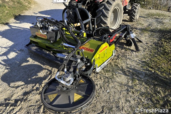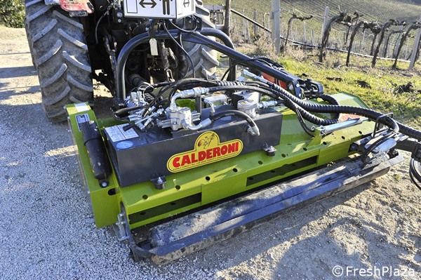 La trituradora adquirida por la empresa de la provincia de Forlì-Cesena cuenta con un enganche central de tres puntos con biela para mayor estabilidad, así como para poder desplazar lateralmente la herramienta. El disco de corte hidráulico para el deshierbe entre hileras tiene un espaciador automático accionado por resorte para mantener la distancia con el tronco de las plantas, un movimiento de giro de ballesta y un sistema hidráulico independiente del tractor.