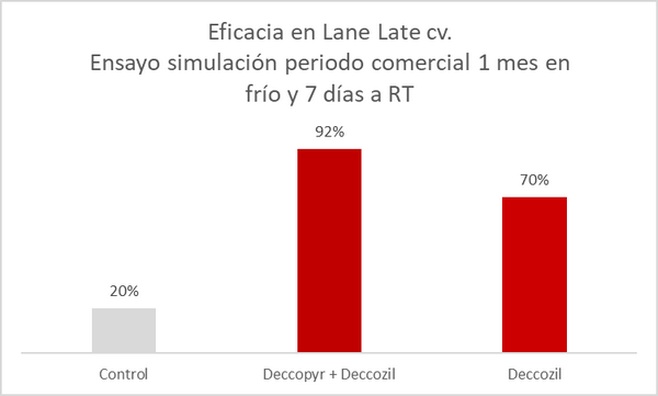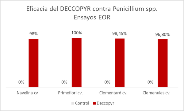 Por lo mencionado anteriormente, tanto el Deccopyr como el Decco IMZ S-7,5 son productos complementarios que ofrecen sinergias positivas cuando se combinan. El Decco IMZ S-7,5 tiene un gran control sobre la esporulación de los hongos del género Penicillium spp y el Deccopyr ofrece un control frente a cepas resistentes a la molécula del imazalil y con su persistencia protege durante todo el periodo de comercialización a los agrios.