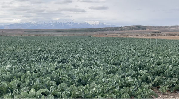 Finca de brócoli de FHF; al fondo, el Moncayo nevado.
