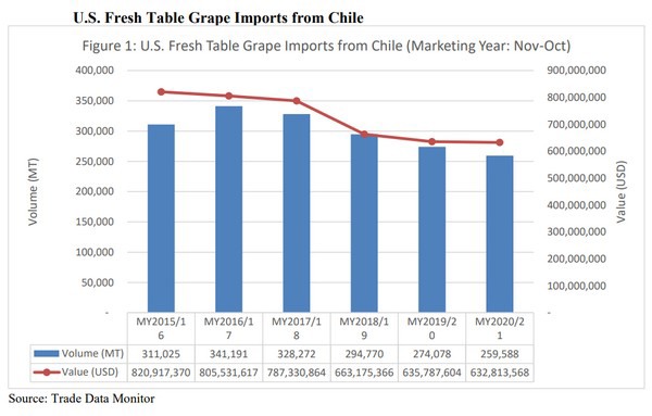 Los Estados Unidos son el destino principal de las uvas de mesa chilenas, y Chile es el mayor proveedor del mercado estadounidense. El 44 por ciento de las exportaciones de uva de mesa de Chile se envían al mercado de los Estados Unidos, y gran parte del restante lo importan China, Corea y la Unión Europea. En la campaña 2020/21, los Estados Unidos importaron 633 millones de dólares de uvas de mesa de Chile, equivalente a 259.588 toneladas.