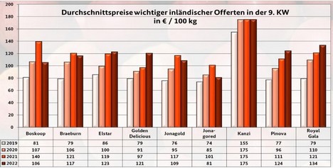 Como es habitual en esta época de la temporada, la oferta nacional de variedades como Elstar, Jonagold y Boskoop dominan el mercado. La calidad en general ha sido convincente, aunque algunas frutas mostraron deficiencias. Desde 2020, una nueva variedad de manzana nativa de Alemania está disponible en los mercados alemanes bajo la marca Fräulein. Es habitual encontrarla en Fráncfort, donde goza de gran demanda.