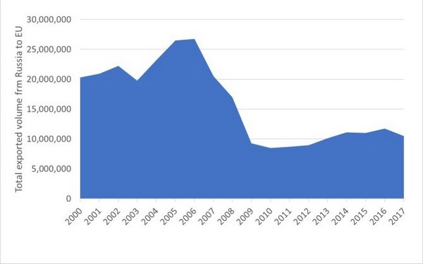 Gráfico 1. Exportaciones totales de madera aserrada de Rusia a la UE desde 2000.