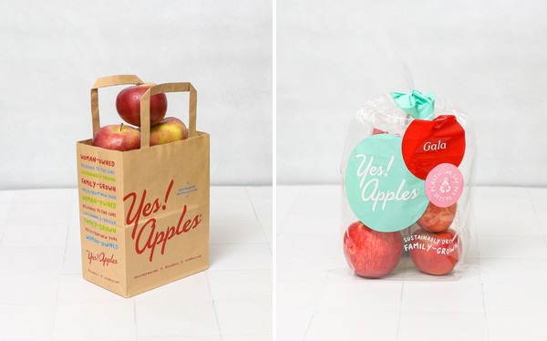 Izquierda: Este otoño, Yes! Apples lanzará bolsas hechas de papel reciclable y compostable. Derecha: Las nuevas bolsas de plástico de la empresa se fabrican con hasta un 5% menos de plástico.