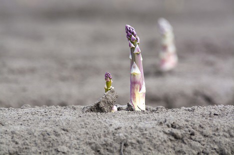 Aunque produce espárragos blancos en túneles, Laurent Bouillard también cultiva violetas para el mercado local. "El espárrago violeta es muy popular en la Provenza, desde Marsella hasta Aviñón. Por eso lo cultivamos sin lona, para que pueda adquirir ese hermoso color violeta antes de volverse verde. El espárrago violeta, también llamado falso verde, es en realidad la etapa intermedia en la evolución del espárrago blanco al verde. Es el mismo espárrago que permanece blanco cuando se cultiva bajo una lona y se colorea gracias a la luz del sol".