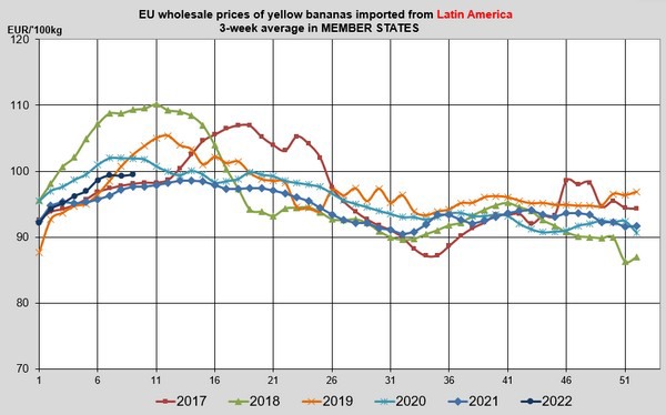 Los precios mayoristas medios de las bananas importadas de América Latina se sitúan en 106 €/100 kg en los Países Bajos, aproximadamente los mismos precios que en Polonia.