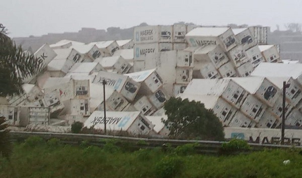 La autopista N2 está bloqueada con contenedores vacíos amontonados de cualquier manera, pues el aumento del nivel del agua movió los contenedores de la base y las pilas se derrumbaron.