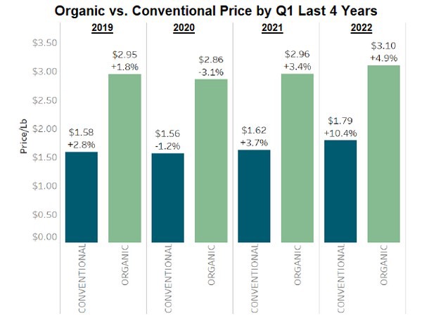 Un precio medio más alto en el primer trimestre es responsable de la mayoría de las ganancias, puesto que los precios medios de los productos convencionales aumentaron más del 10% en comparación con el primer trimestre del año pasado. Por el contrario, los precios de los productos ecológicos aumentaron un poco menos del 5%, lo que sugiere que han sido capaces de absorber más el aumento de los costes relacionados con el entorno inflacionario actual.