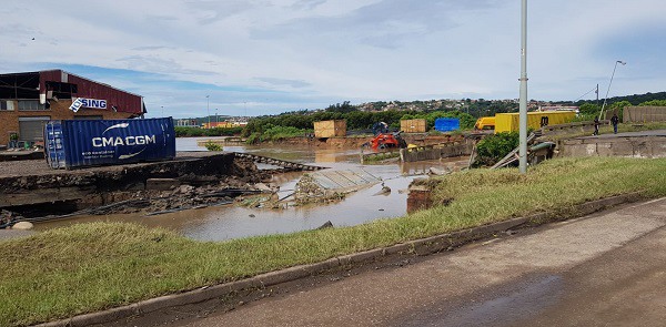 Daños por la inundación en la carretera de Bayhead, que da acceso a la terminal de contenedores de Durban