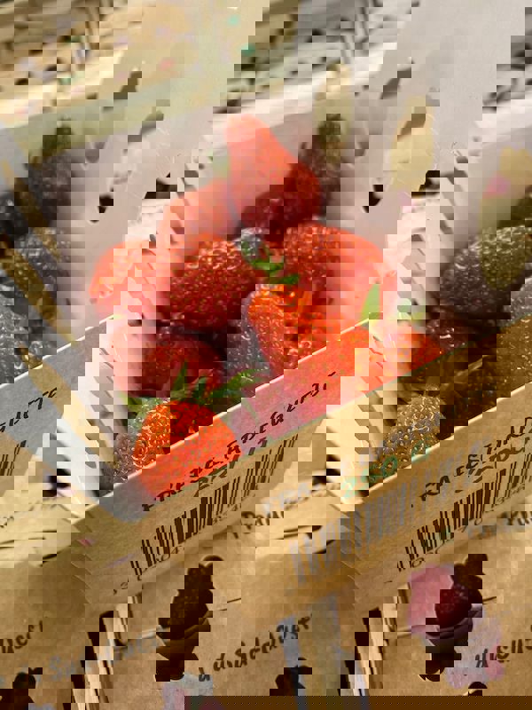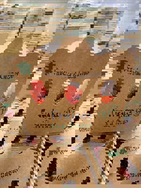 Este año, por primera vez, Biogaronne comercializa sus fresas en una versión neutra de bandejas de cartón completamente cerradas: "Antes, vendíamos nuestras fresas en bandejas de cartón abiertas. Pero con la crisis sanitaria y debido a los robos en las tiendas, ahora vendemos las fresas en bandejas cerradas. Para garantizar la máxima visibilidad, hemos perforado los laterales con aberturas en forma de fresa. A petición de nuestros clientes, hemos optado por la sobriedad, que resalta el origen suroccidental".