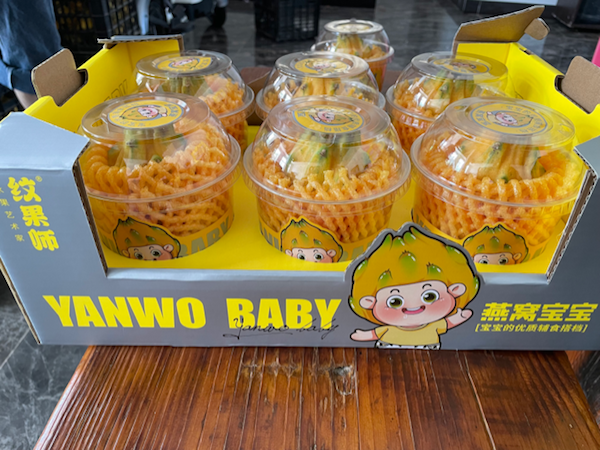 "Tenemos una serie de productos frutales adecuados para niños pequeños. Dirigimos esta serie de productos a bebés y madres. Esta serie incluye pitahaya amarilla, manzanas, pampelmusas y naranjas. Todos ellos están sujetos a estrictas pruebas de seguridad alimentaria. También hemos diseñado nuestra propia mascota para atraer la atención de los clientes más jóvenes. Esta mascota parece una bonita fruta bebé. La mascota aparece en nuestro envase con una gama de colores a juego". Zhou también explica su estrategia de marca. "Nos dirigimos a diferentes segmentos del mercado. Actualmente nuestro objetivo es el mercado de gama alta. Esperamos ofrecer al mercado nuevos productos frutícolas de alta calidad. Nuestro deseo es que los consumidores que busquen productos frutícolas seguros y de alta calidad puedan comprar y disfrutar fácilmente estas frutas".