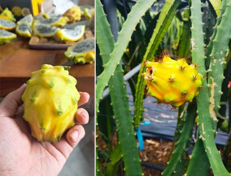 A la pitahaya amarilla también se la conoce como "nido de golondrina" en China. Esta fruta se parece a la pitahaya convencional, pero su cáscara es amarilla. La pitahaya amarilla es dulce y rica en nutrientes. Aunque todavía es poco común, va ganando presencia gradualmente en los mercados de frutas.