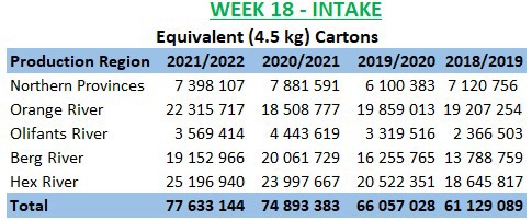 Los volúmenes nacionales de entrada han alcanzado 77.633.144 cajas (de 4,5 kg) en la semana 18, lo que representa un aumento del 3,6% en comparación con la semana 18 de 2020/2021.