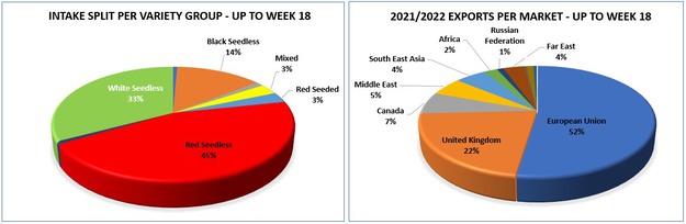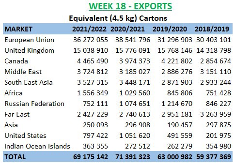 Los volúmenes de exportación aún no son definitivos, ya que se espera que se comuniquen más datos. Ha habido algunas diferencias notables en los volúmenes de exportación, como una disminución del 30% en las exportaciones de Rusia debido al conflicto en curso en la zona. También hemos visto un aumento de las exportaciones a Oriente Medio y al sudeste asiático, zonas que han aumentado un 17% y un 2,3% respectivamente, en comparación con la semana 18 de 2020/2021.
