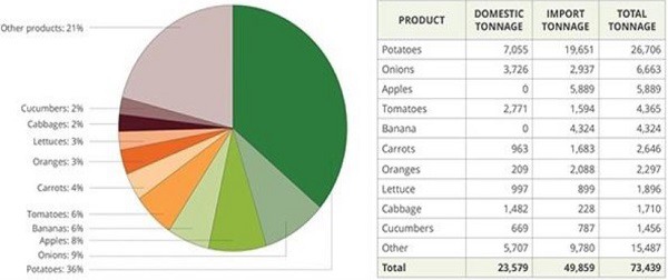 Producción hortícola nacional e importada en Namibia en 2018 (fuente: Consejo Agronómico de Namibia)